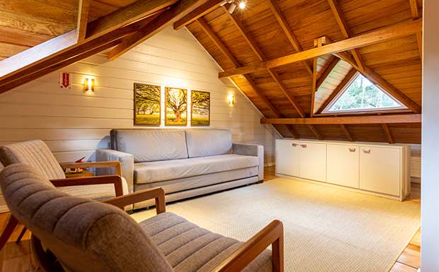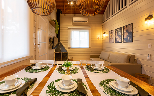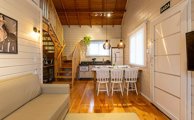 As cabanas do Condado de Urubici são espaçosas e aconchegantes, com uma área de 73 m², comportando até 6 pessoas. Cada cabana possui sala de estar com lareira, ar-condicionado e sofá-cama, cozinha completa, quarto de casal com ar-condicionado, mezanino com sofá-cama e banheiro com hidromassagem e vista para a natureza. A estrutura das cabanas garante conforto e privacidade para os hóspedes, tornando a estadia ainda mais agradável.